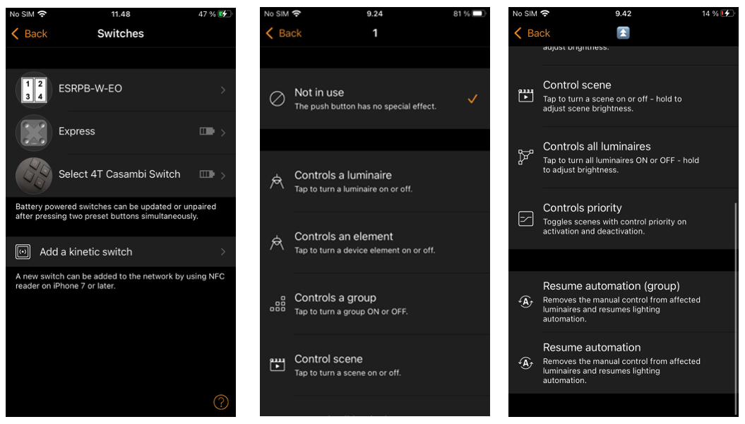 You will be presented with various options depending on the type of Casambi enabled switch (e.g. The amount of push buttons available to configure, or configuration options for a rotary control).