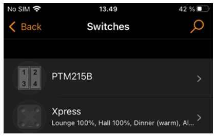Tip: If you are within Bluetooth range of the switch you wish to program, easily identify it by selecting Switches from the More tab. You will then see a magnifying glass in the top right of the screen. Push the magnifying glass and you will then be prompted to Push a button within 10 second. Push the switch you desire to program and the programming options for that switch will automatically open. You can then configure and rename that specific switch as desired. If you are not within Bluetooth range of any switches the magnifying glass icon will not appear.