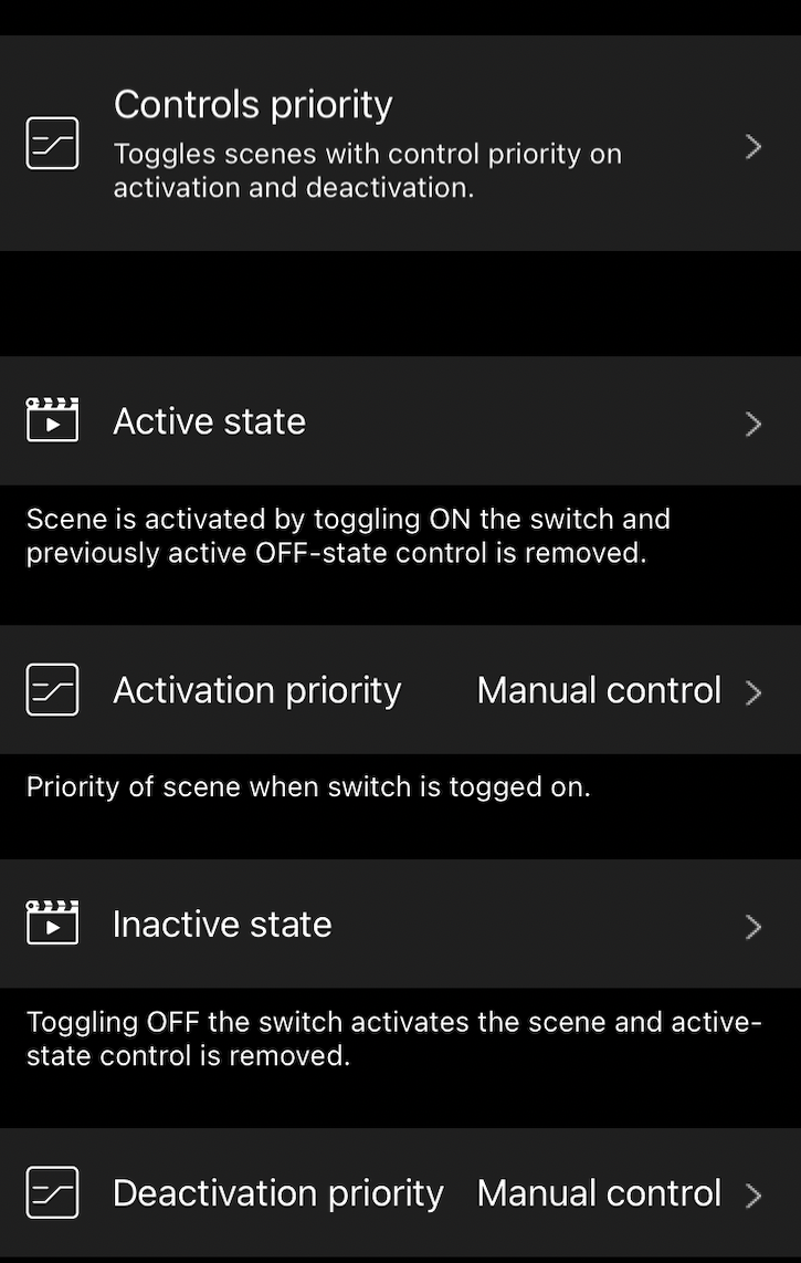- Normally this would be set to “Higher than manual” because you do not want the inactive scene to be possible to override by still using other switches in the room.