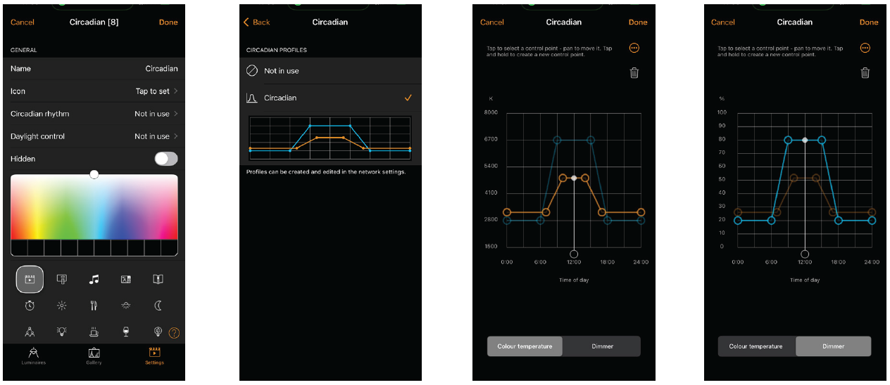 Circadian profiles define time‑based control curves over a 24‑hour cycle, where the horizontal axis represents the time of day and the vertical axis represents control parameters. These profiles allow control of color temperature, dimming level, or both simultaneously for tunable white luminaires.