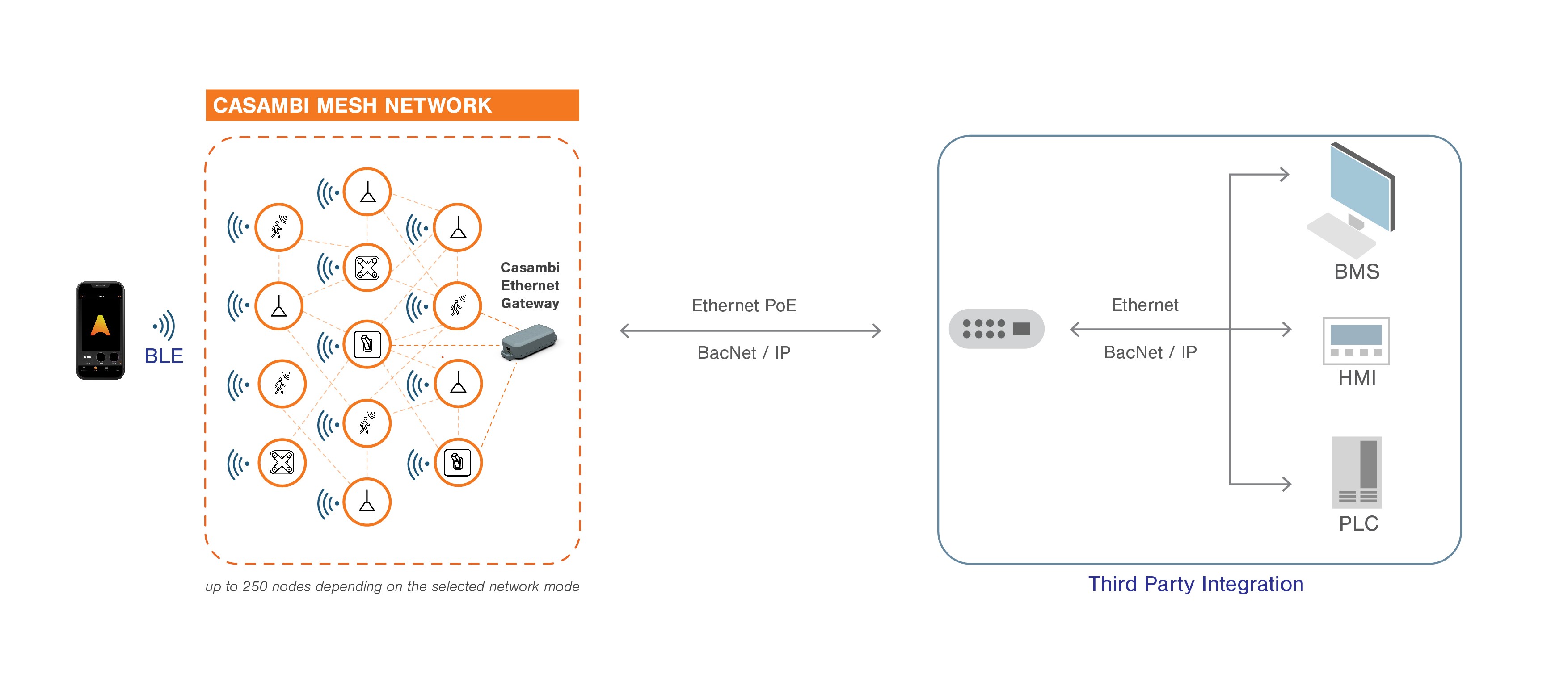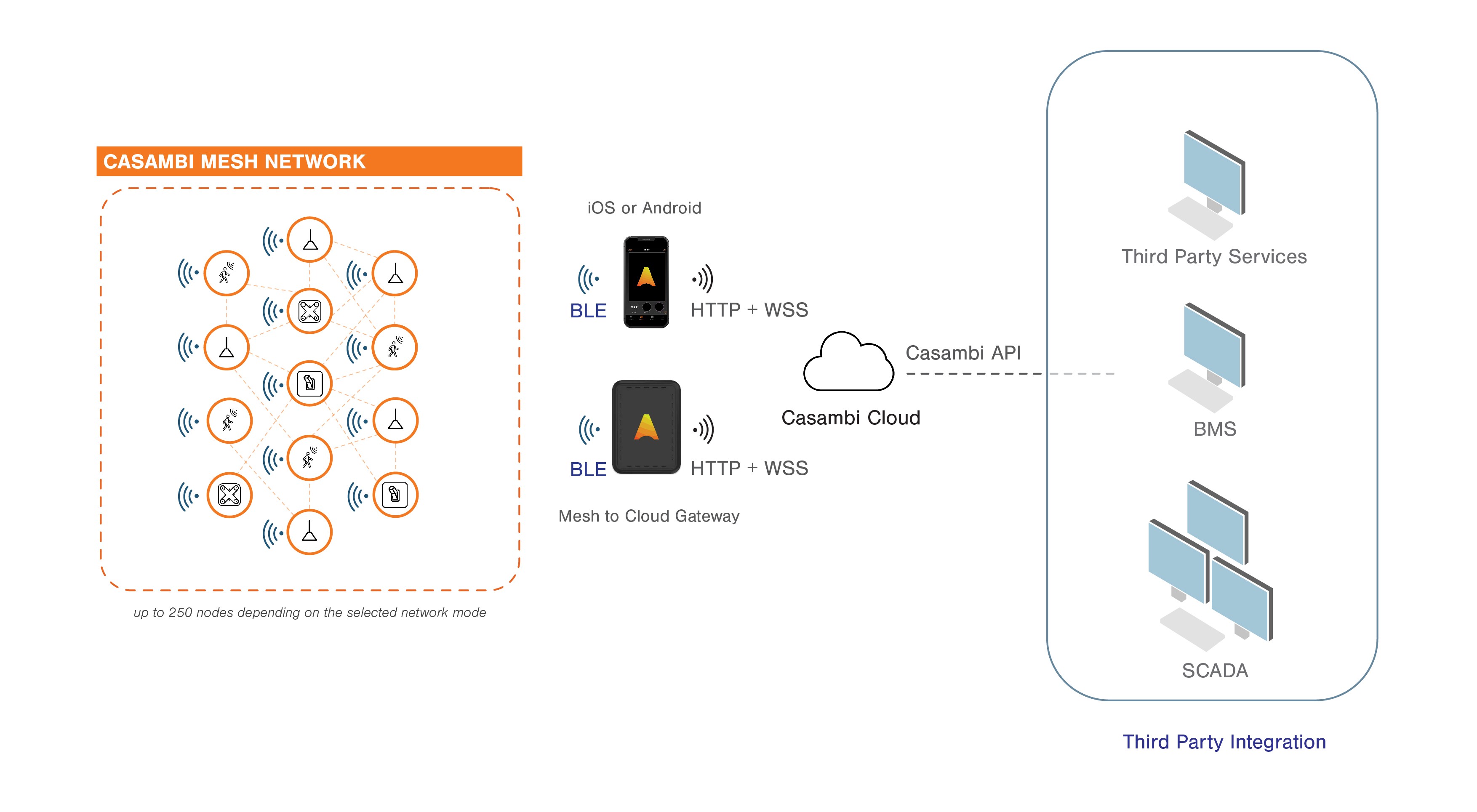 Essendo la tecnologia radio a bassa potenza più popolare e affidabile presente oggi in tutti i dispositivi moderni, il Bluetooth® Low Energy funge da mezzo di comunicazione tra un telefono cellulare o altro dispositivo di controllo e una rete Casambi. La tecnologia di Casambi stabilisce una rete mesh specializzata, nota come ‘Casambi Mesh’, appositamente progettata per i controlli dell’illuminazione, facilitando una comunicazione wireless sicura e criptata da dispositivo a dispositivo all’interno della rete di illuminazione.
