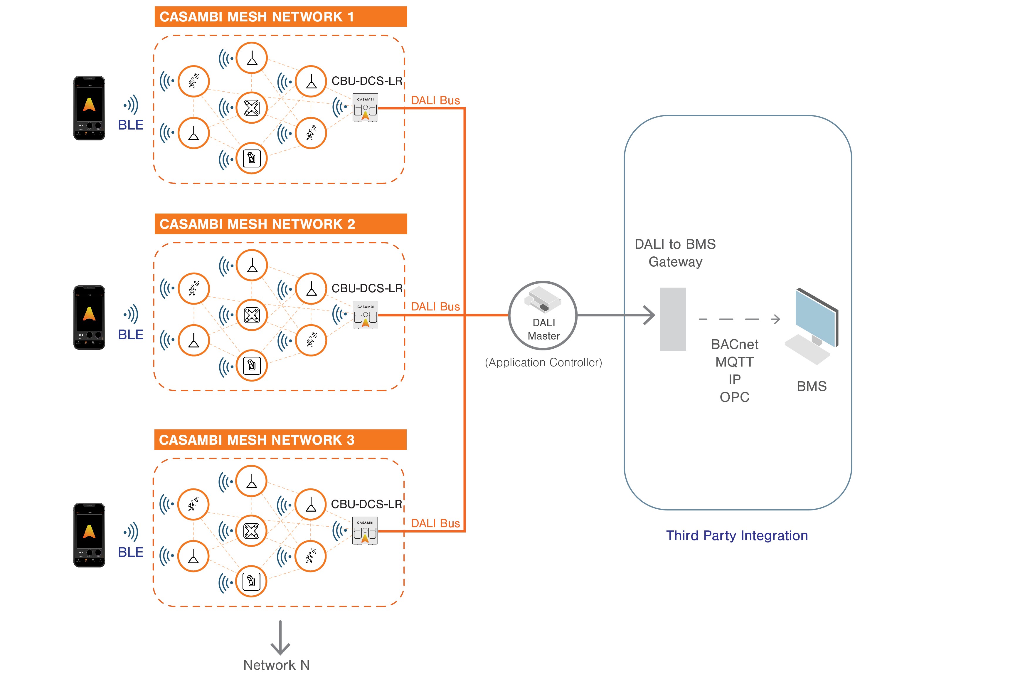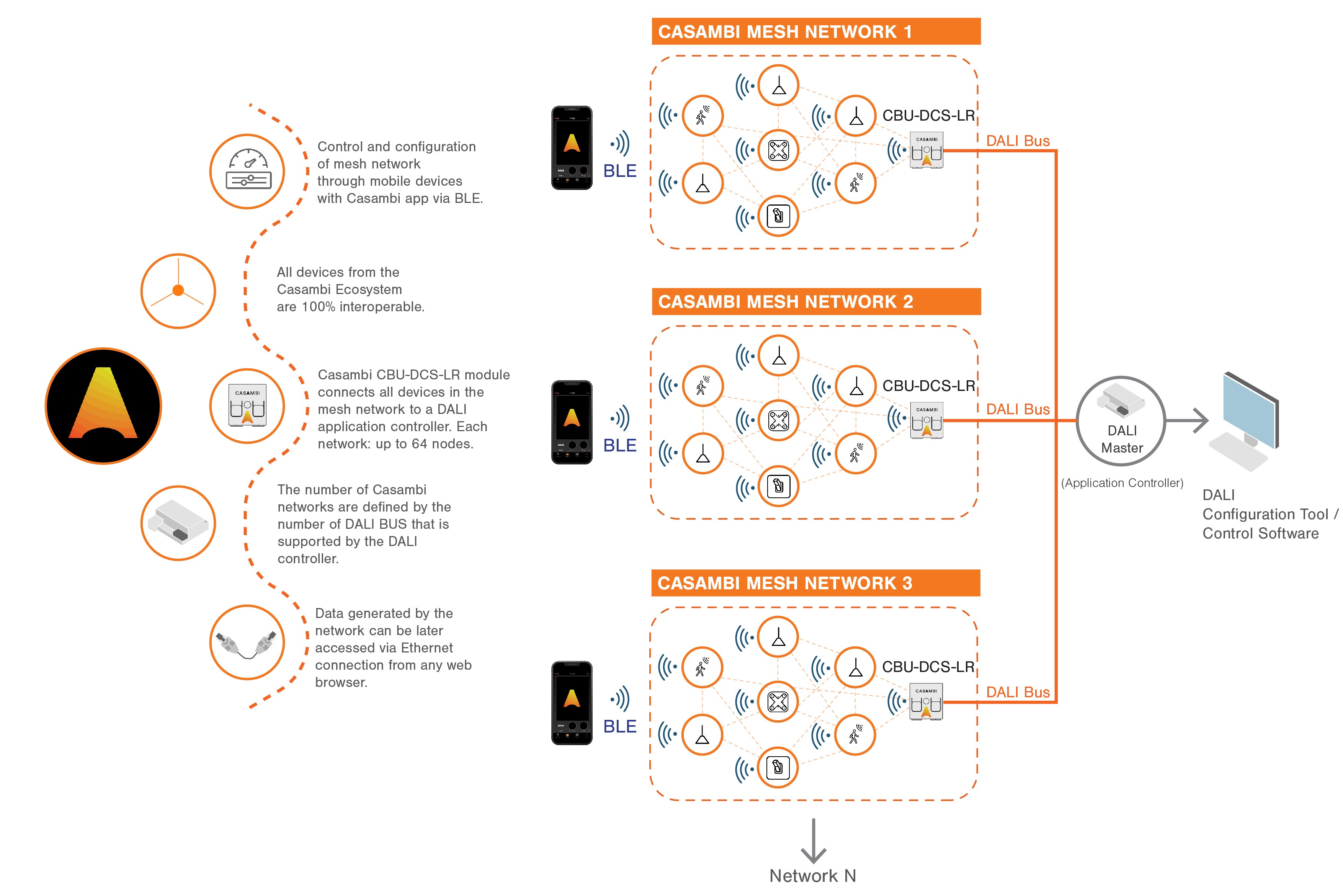 Le reti Casambi possono interfacciarsi anche con sistemi e protocolli di terze parti tramite il Gateway Casambi DALI e un Application Controller DALI di terze parti.