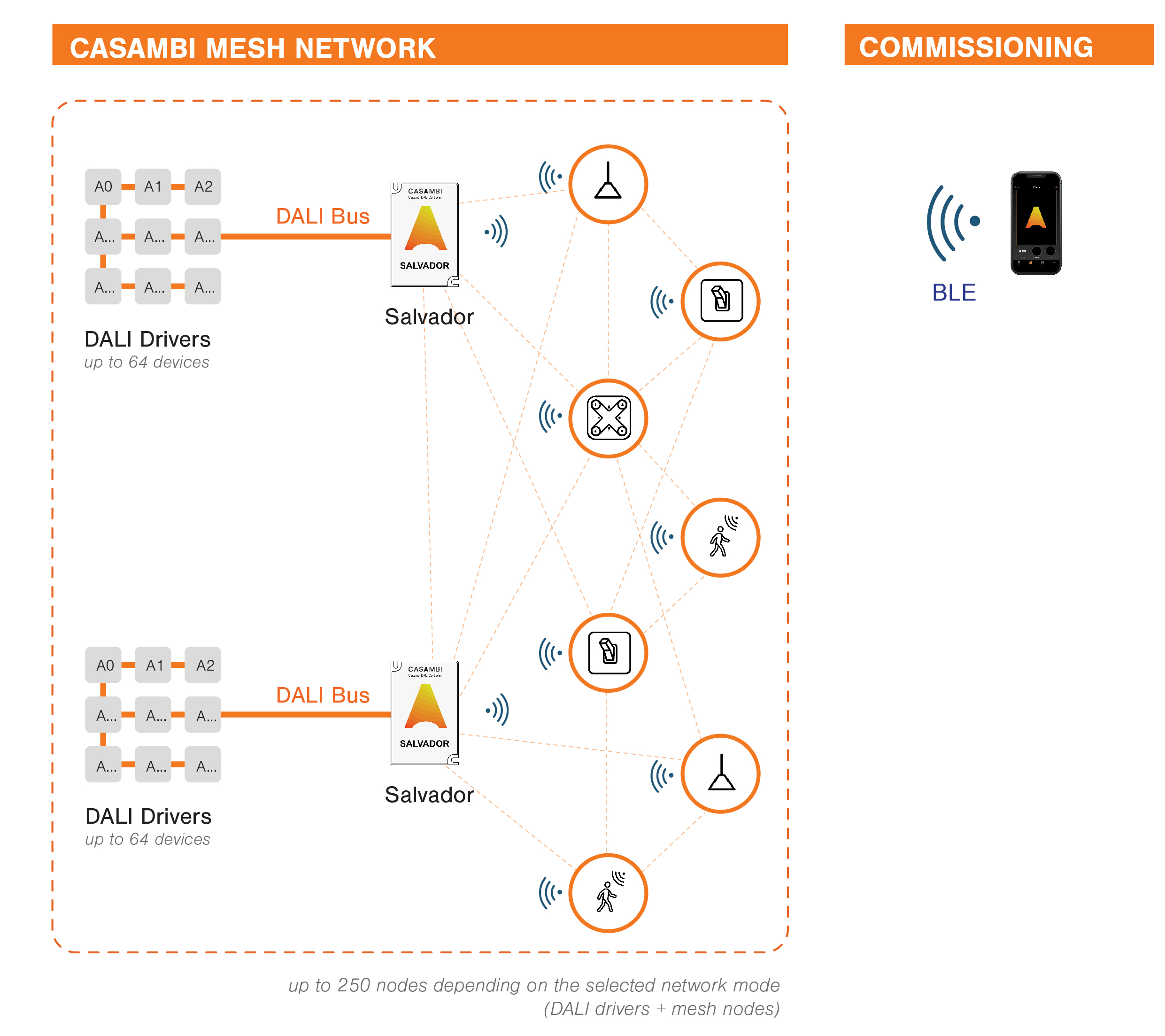 Salvador consente la programmazione e il controllo di fino a 64 corpi illuminanti DALI individualmente dall’app Casambi. Più dispositivi Salvador che controllano corpi illuminanti DALI possono anche essere collegati senza fili per formare una singola rete mesh Casambi. Una rete Casambi può supportare fino a 250 nodi, indipendentemente dal fatto che siano DALI o Casambi ready. Ad esempio, tre dispositivi Salvador che controllano ciascuno 64 corpi illuminanti DALI possono essere collegati insieme, formando una singola rete mesh Casambi. (64 nodi + 1 Salvador = 65 nodi ciascuno x 3 = 195 nodi).