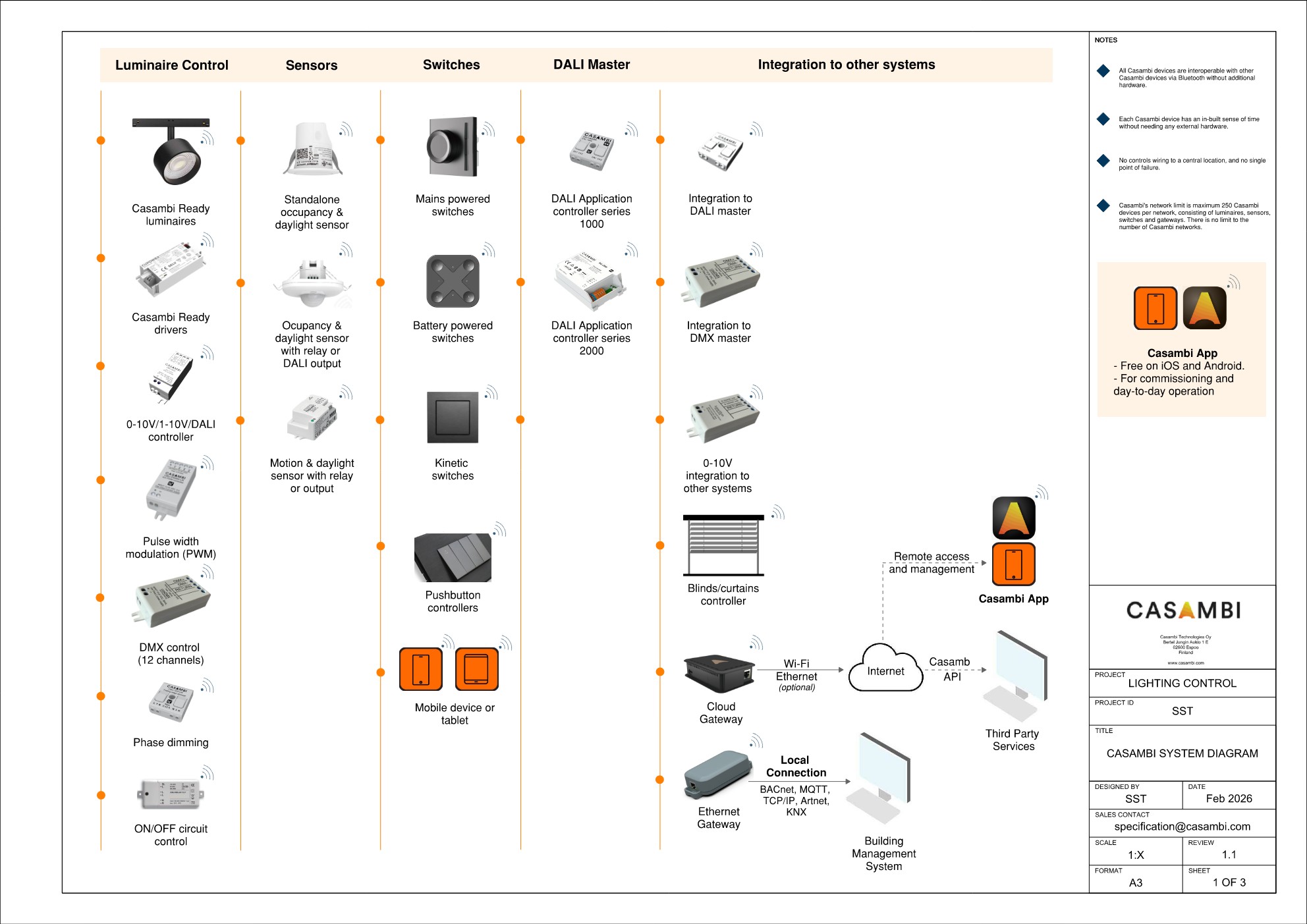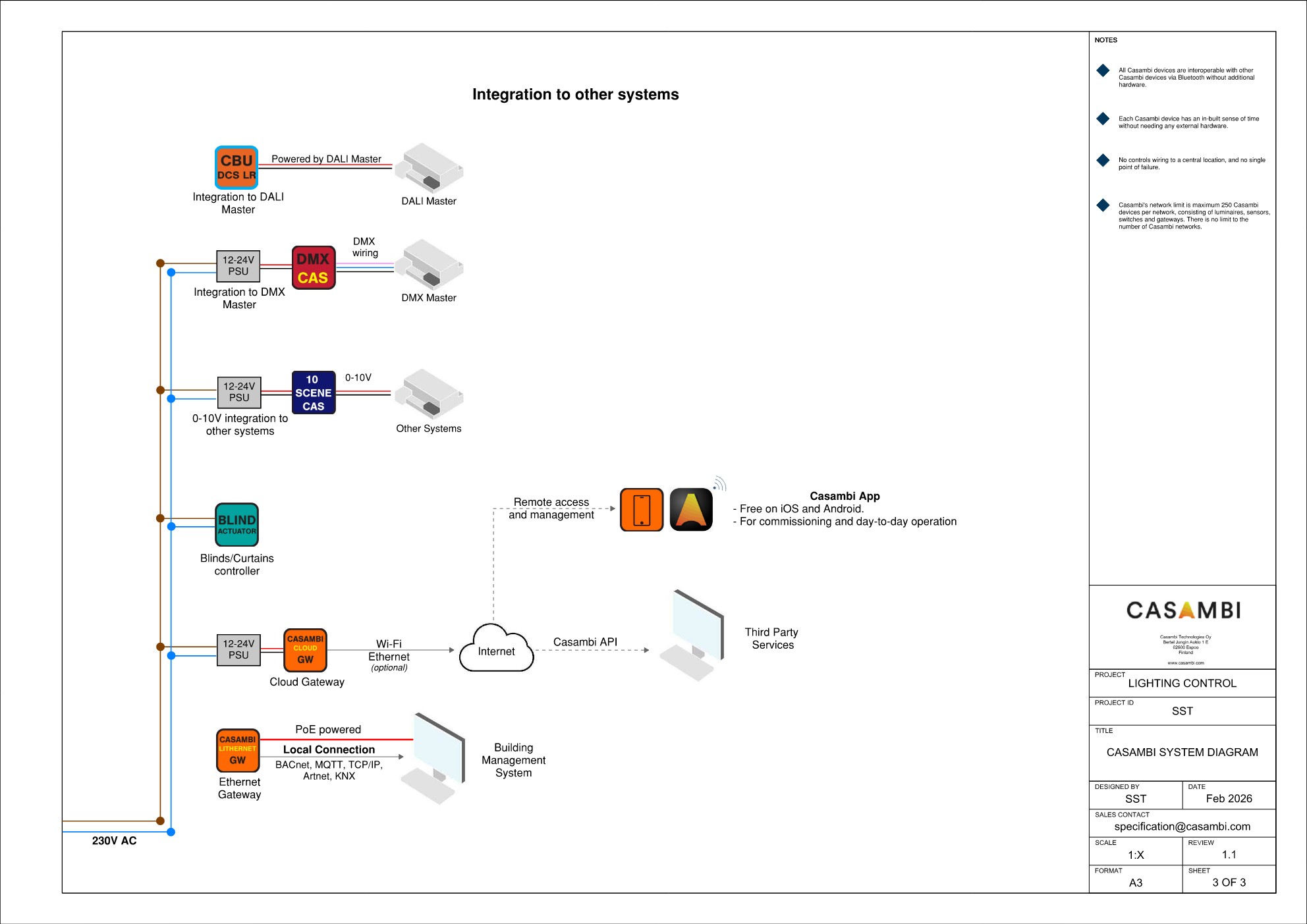 Alternativamente, un Gateway Ethernet dell’Ecosistema Casambi può essere utilizzato per interfacciare altri sistemi o protocolli senza passare attraverso il Cloud, mantenendo tutti i dati all’interno dell’edificio: