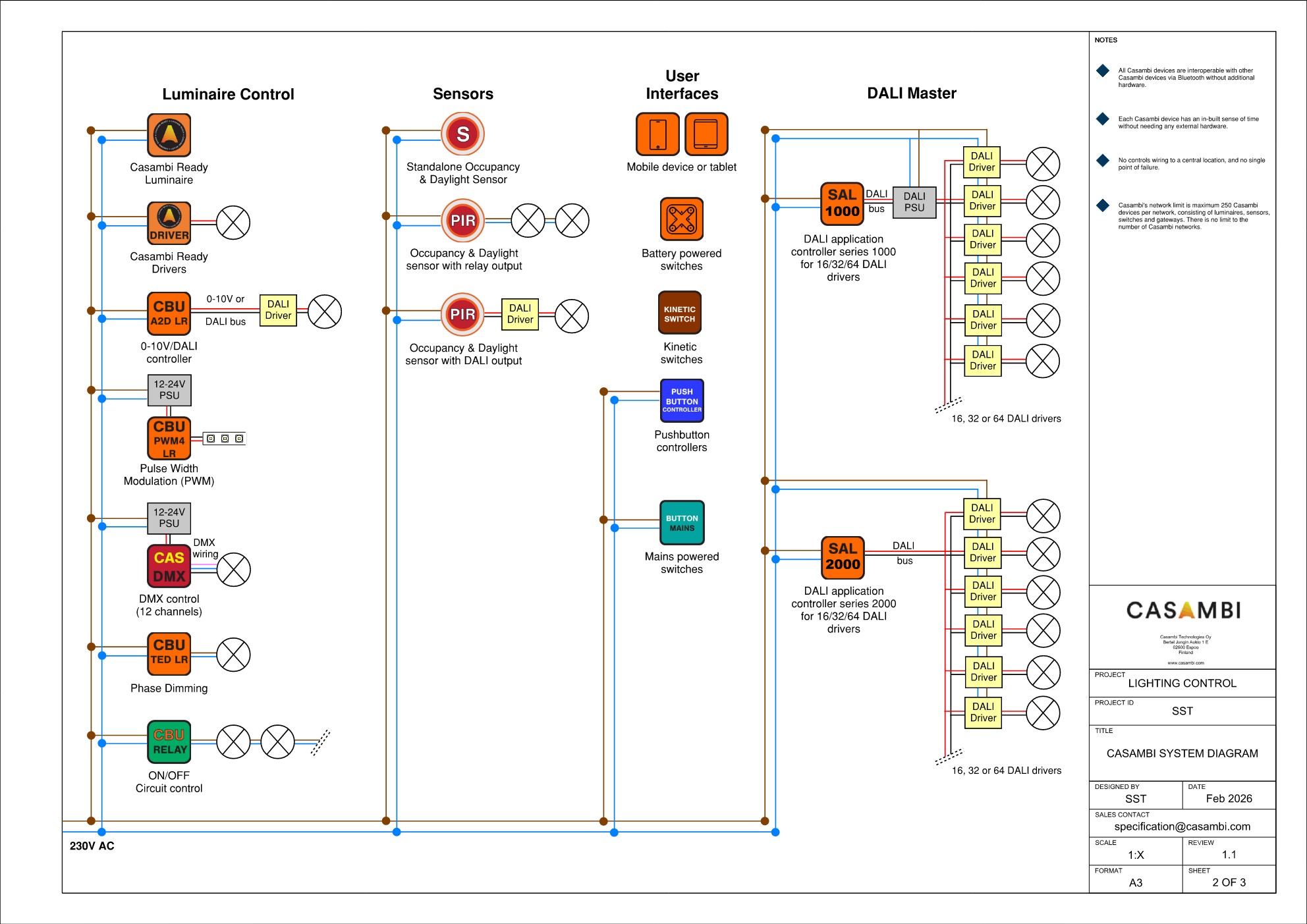 | Salvador 2000 DALI controllers | Il controller DALI Salvador Series 2000 integra i driver DALI cablati nel sistema Casambi, con una singola unità in grado di controllare fino a 64 driver DALI. Le lampade DALI, una volta incorporate, appariranno nella rete Casambi come lampade virtuali. Il controller DALI Salvador Series 2000 è dotato di alimentatore integrato, orologio in tempo reale (RTC) interno con accumulo di energia di backup e protezione antistrappo del cavo per facilitare un processo di installazione senza intoppi. |